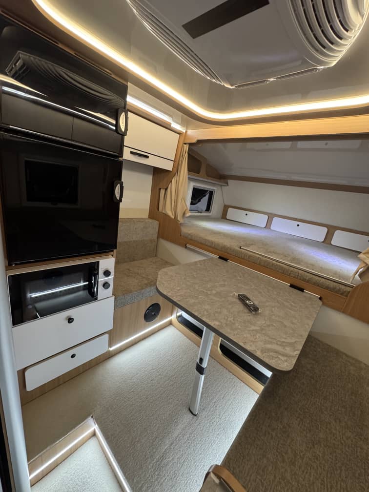 Im Campingbetrieb lässt sich das Dach komfortabel erweitern, wodurch zusätzlicher Raum für Schlafplätze, Küchenmodule, Sanitärraum mit Toilette oder Dusche und Stauraum entsteht. So wird auch eine kleine Kabine zu einem komfortablen Begleiter auf Reisen.